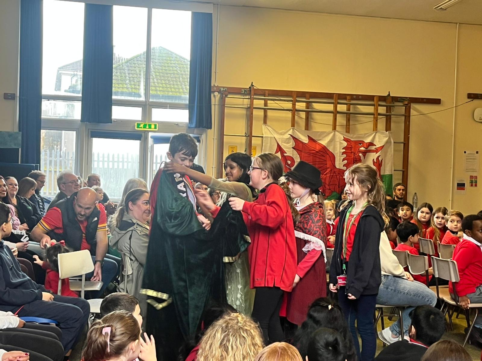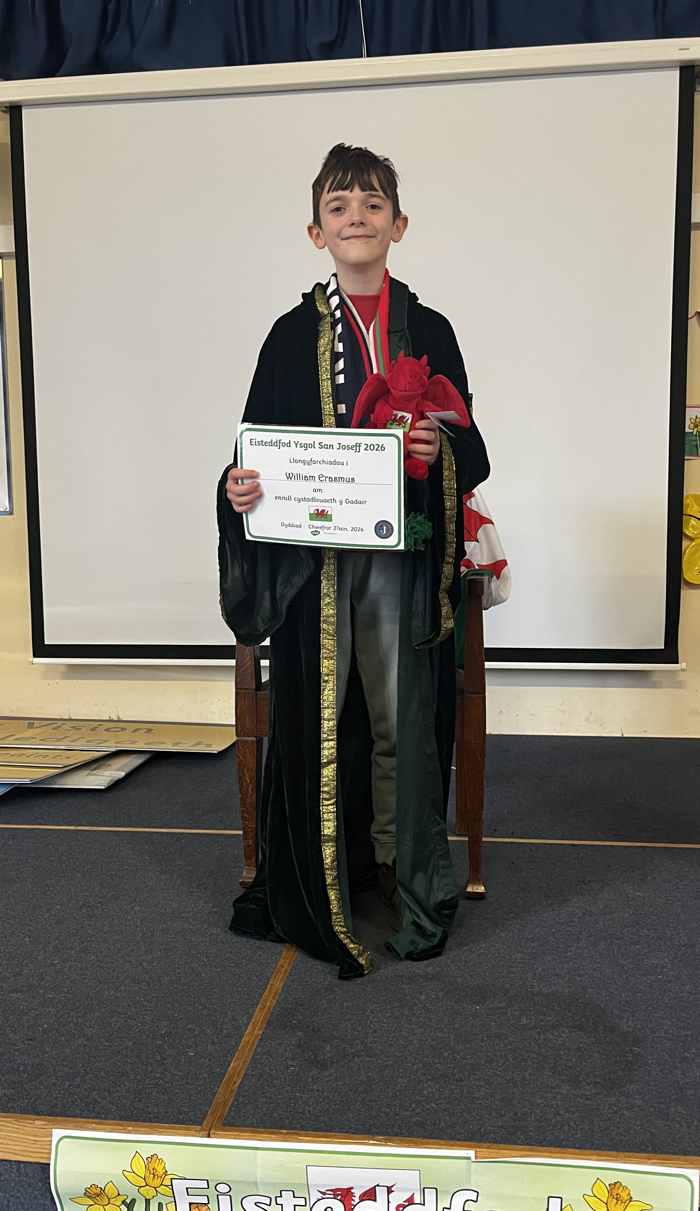 Then we had our 'Crowning of the Bard' ceremony. Year 6 had written poems about their 'Cynefin' and they were judged by Mrs Weaver, our Welsh Lead and Mr Maddock, the yr 6 teacher. The winner of our 2026 Eisteddfod and our 2026 Bard was announced as William Erasmus. Llongyfarchiadau i Wiiliam!